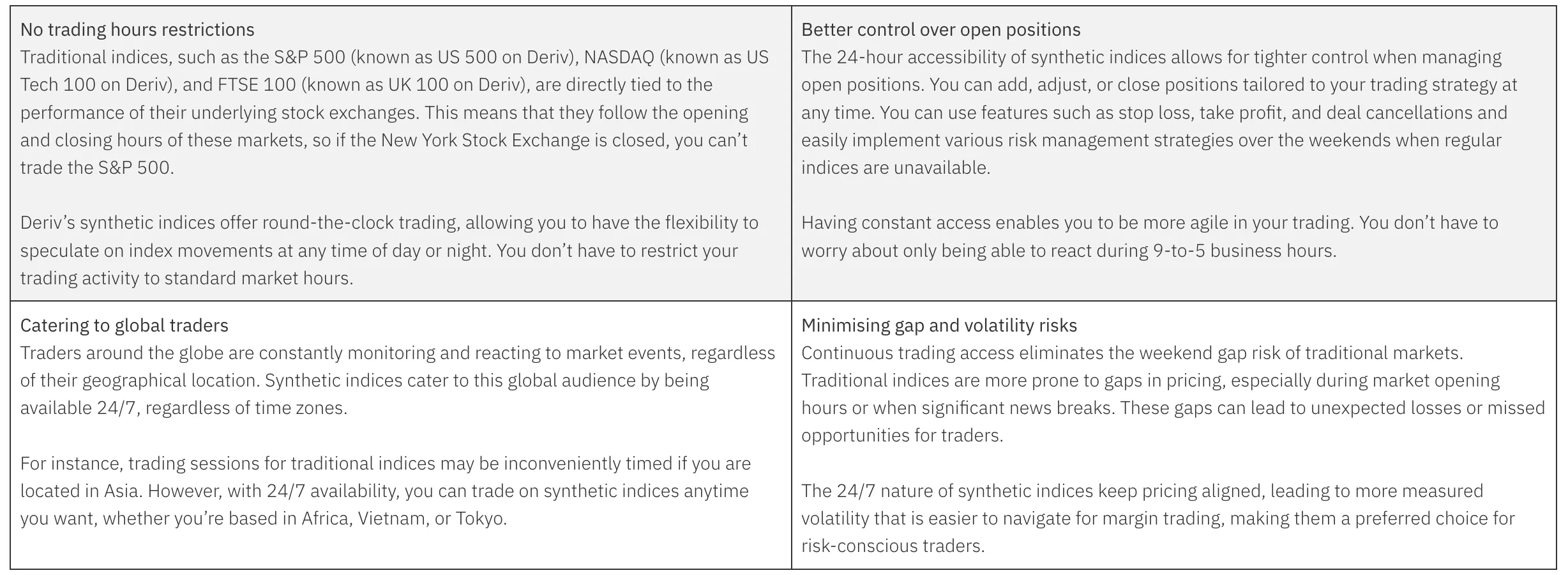 Synthetic indices are a versatile and flexible trading instrument that can be used by traders of all experience levels. The 24-hour trading availability of synthetic indices differentiates them from conventional indices and provides significant advantages to traders. By breaking free of restrictive trading hours, synthetic indices truly empower traders.
