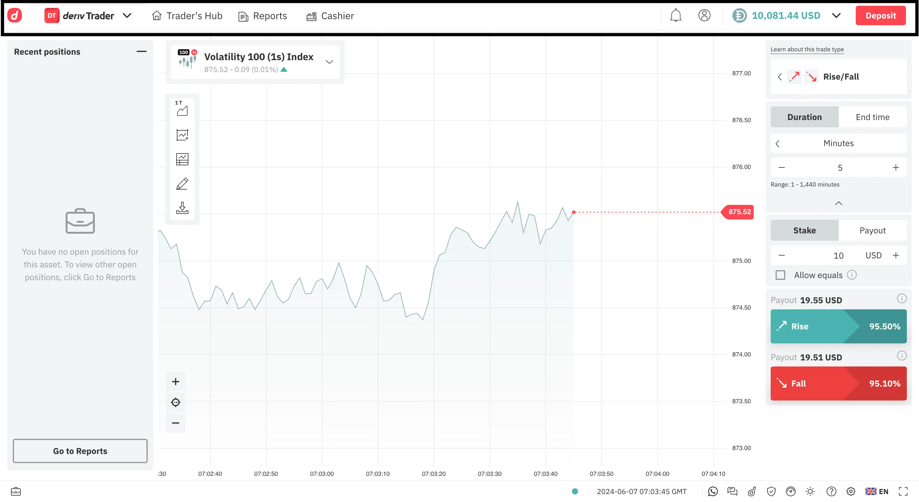 The minimum stake varies depending on the market and asset and ranges from 0.35 USD to 1 USD. This gives beginners an opportunity to start trading and learn concepts in a practical and cost-effective way. Even if you start with low capital, you can still explore different trade types, markets, and strategies.