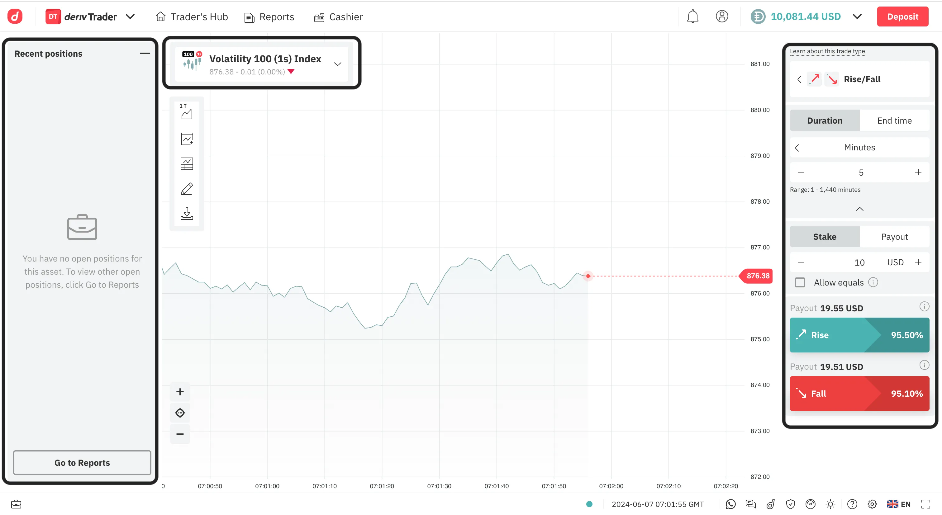 You’ll see the Deriv Trader dashboard right after logging in to your account. On the dashboard you can open a trade with your preferred asset, set your trade parameters, and modify or close your trade.