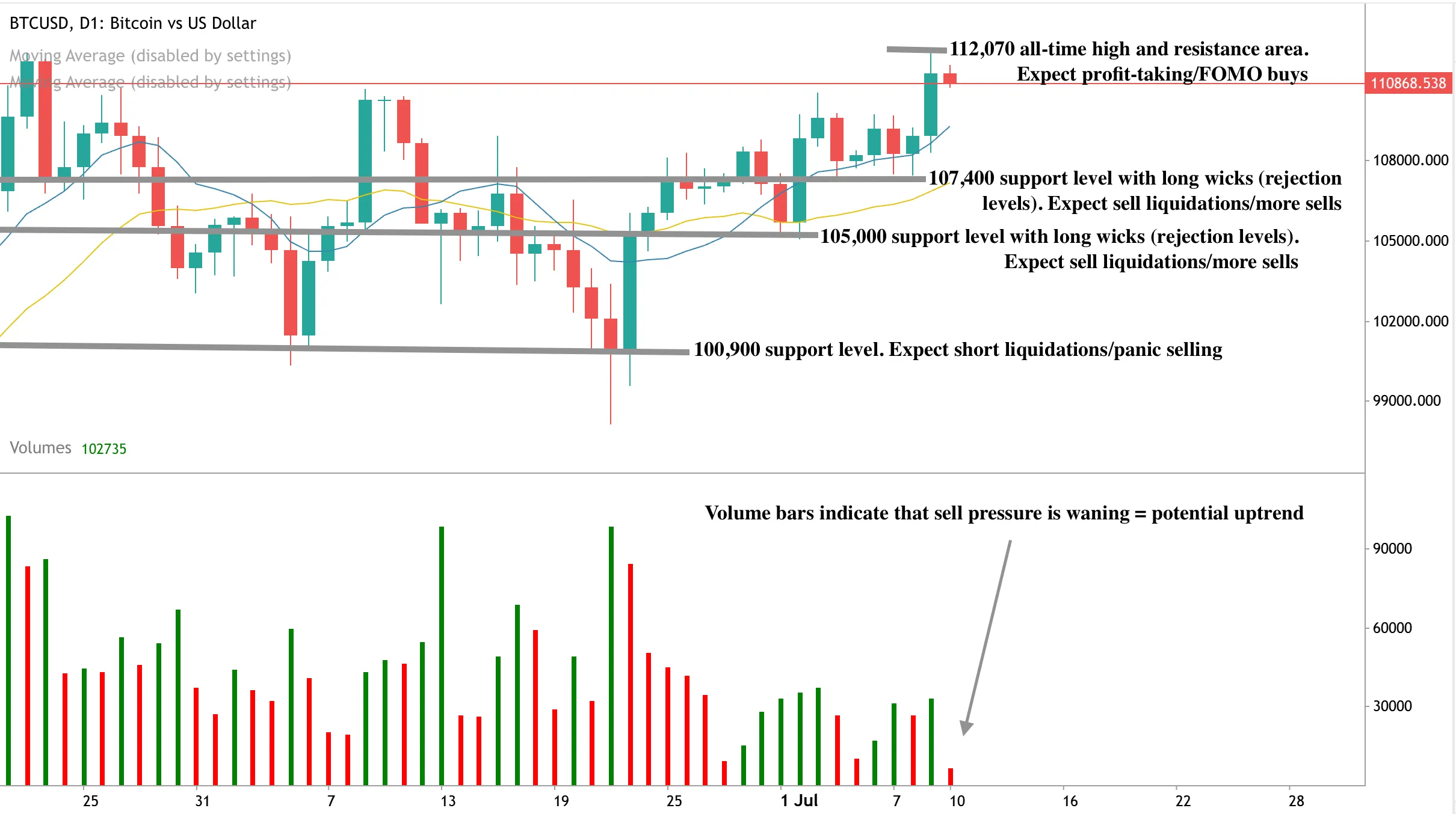 At the time of writing, Bitcoin is seeing some pullback from its all-time high, with clear signs of profit-taking. The volume bars, on the other hand, tell the story of dominant buy pressure over the past days, with sellers offering little resistance, hinting at a potential further uptick. If the uptick materialises, we could see buyers face resistance around the all-time highs. Conversely, if we see a slump, prices could be held at the $107,400 and $100,900 support levels.