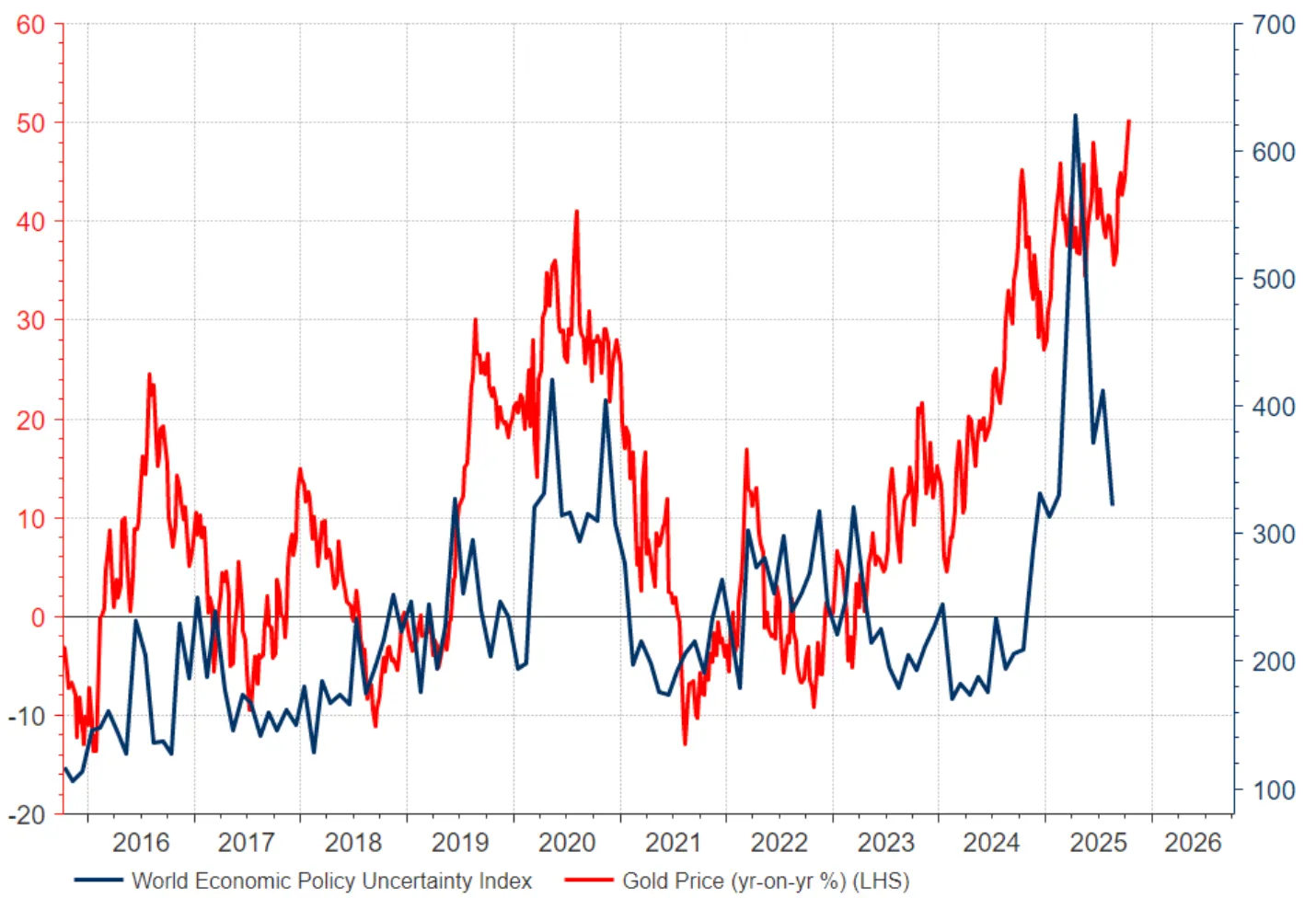 Gold’s acceleration has begun to outpace traditional drivers. Historically, falling real interest rates and rising geopolitical risk explain most of gold’s strength. But even as uncertainty indices have declined and the U.S. dollar has firmed, gold has refused to retrace.