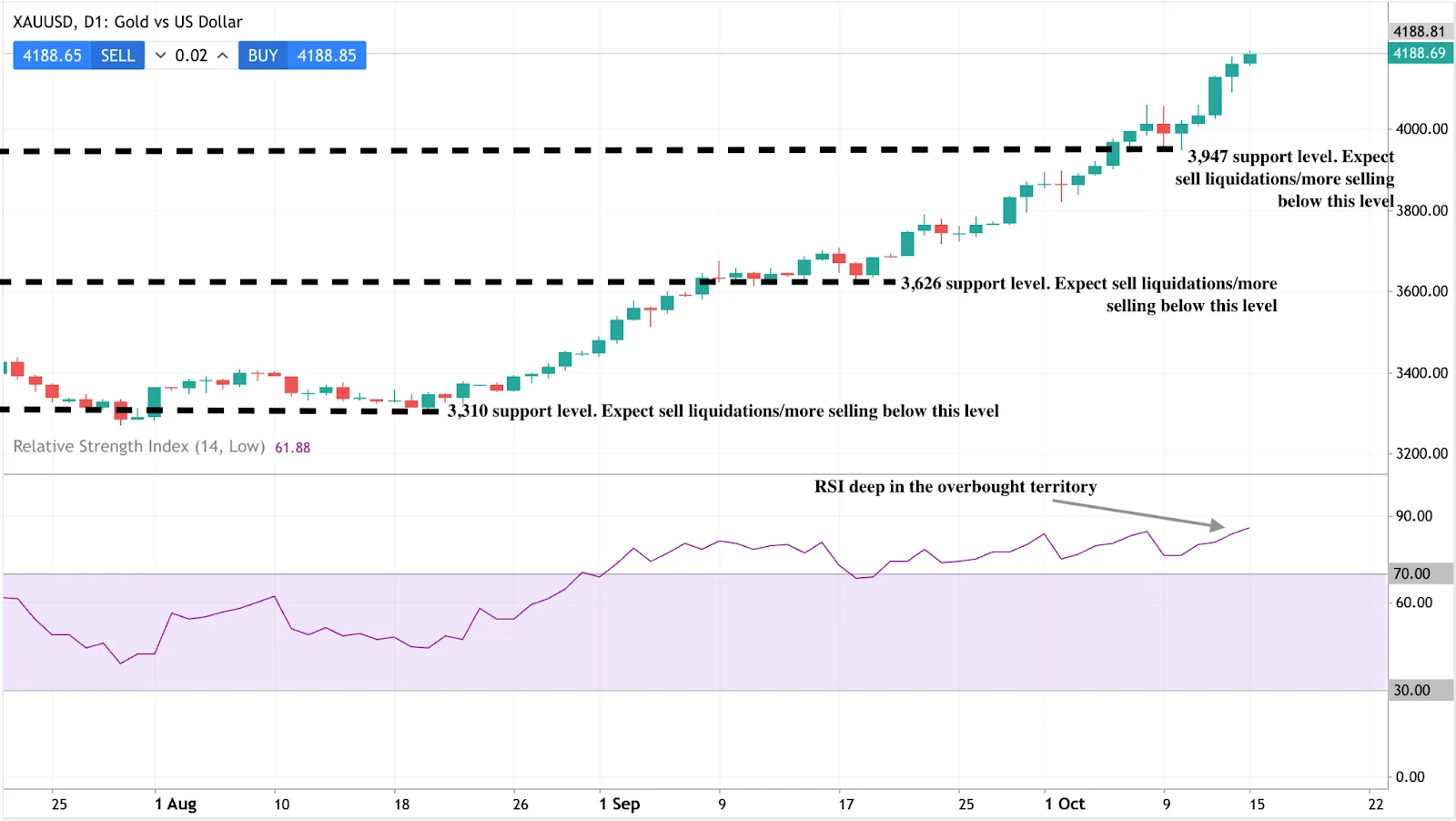 Gold is currently trading just above $4,100, holding steady above key short-term support at $3,947. If prices maintain this base, bulls could attempt another run toward $4,250 and then $4,300. Failure to hold the $3,947 support could trigger a short-term pullback toward $3,626 and $3,310, levels that may attract renewed buying from central banks and long-term investors.