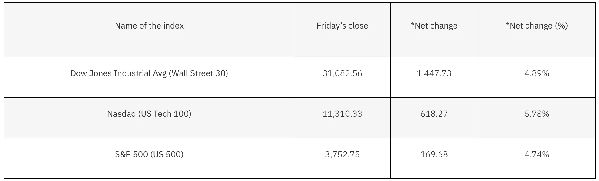 *Net change and net change (%) are based on the weekly closing price change from Friday to Friday.