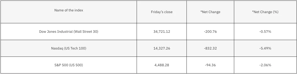 The Dow Jones Industrial Average shed 200 points to close -0.57% lower. Meanwhile, the S&P 500 declined by 94 points, equalling a -2% drop. The tech-heavy Nasdaq Composite took the largest hit, plummeting by 832 points to end -5.5% lower.