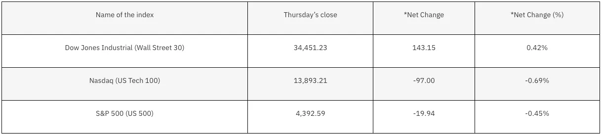 The Dow Jones Industrial Average closed the short trading week 0.42% higher at 34,541. Meanwhile, the S&P 500 closed at 4,394, ending the week down by 0.45%. The tech-heavy Nasdaq 100 declined by 0.7% to finish around 13,893 for the week.