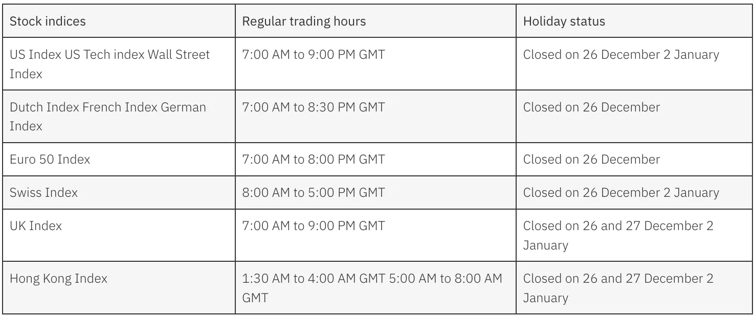 Stock markets are only open for trading on normal business days — Monday to Friday. Listed below are the holiday schedules of some of the major stock indices that we offer.