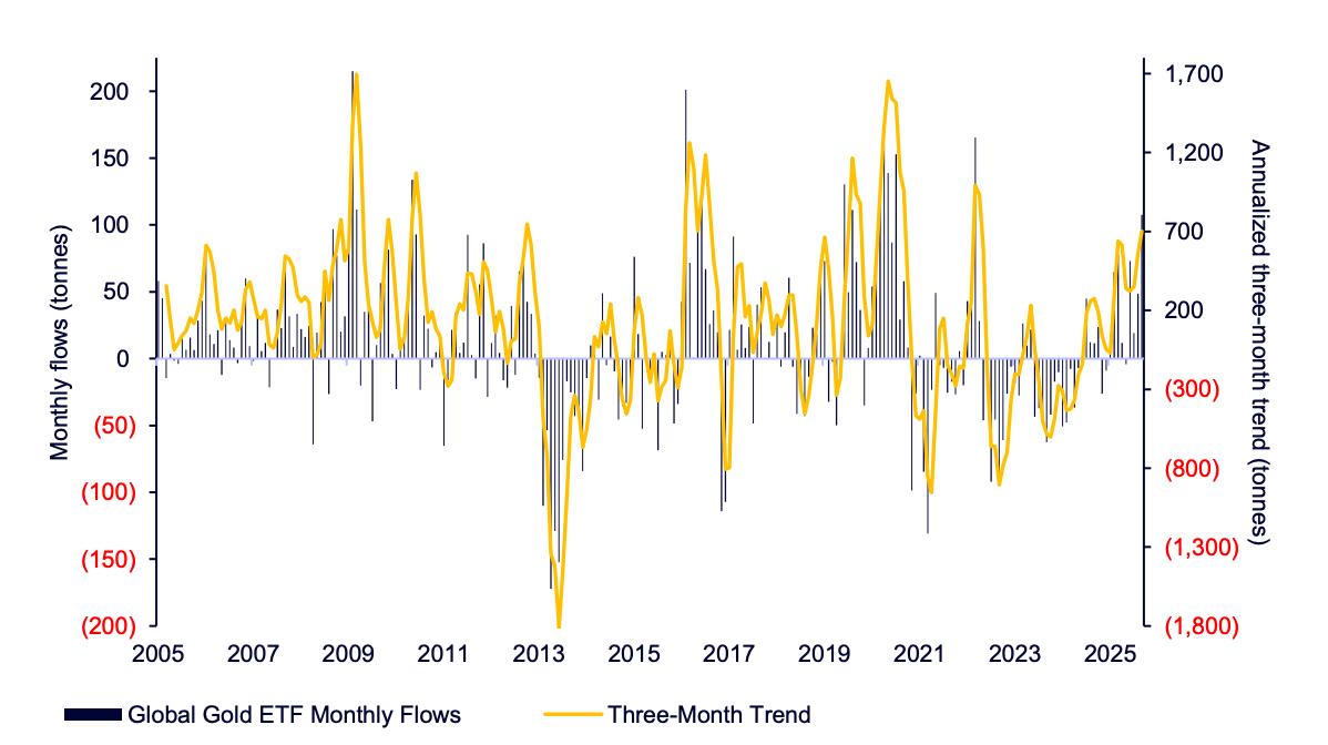 Gold’s 2025 rally began in March, when prices broke the $3,000 mark, then $3,500 in April, and $3,800 by September. Each breakout has been supported by consistent ETF inflows and central-bank demand, which together are creating structural buying pressure.